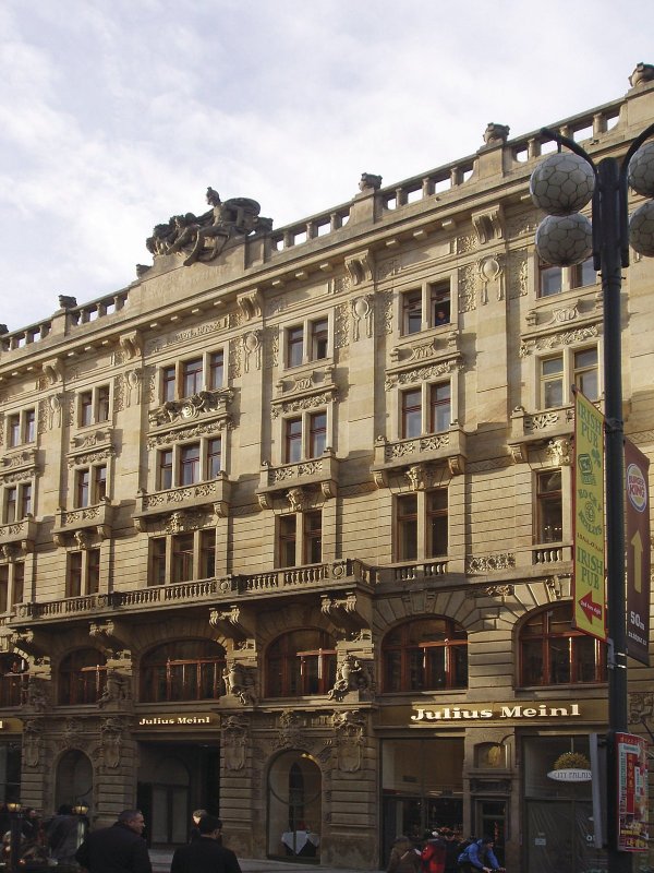 Další Polívkou vytvořená budova původně pojišťovny je v Praze na Staroměstském náměstí čp. 932 a 934. Dokončena byla v roce 1898 a dnes je sídlem Ministerstva pro místní rozvoj. Na této budově je už patrný přechod od neobaroka k secesi (obr. 4). Na výzdobě se také podíleli i výtvarníci mladší generace jako Ladislav Šaloun nebo Bohuslav Schnirch.