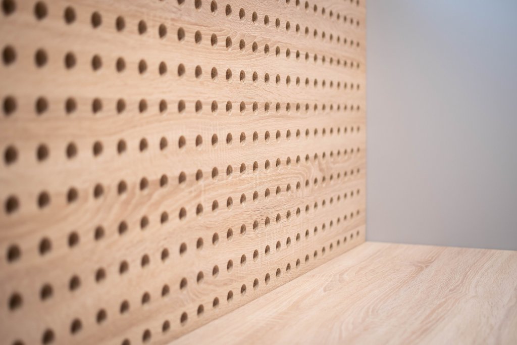 Veškerý nábytek je z laminovaných desek s jemným dřevodekorem. Na podlahu zvolili architekti po poradě s majiteli vinyl, v koupelně je efektně a s citem zkombinována drobná kruhová mozaika žluté a bílé barvy, s níž příjemně kontrastují velké formáty šedých keramických dlaždic.