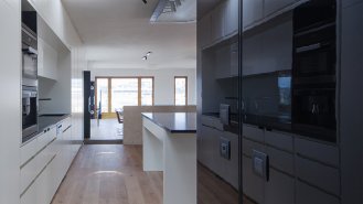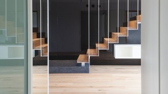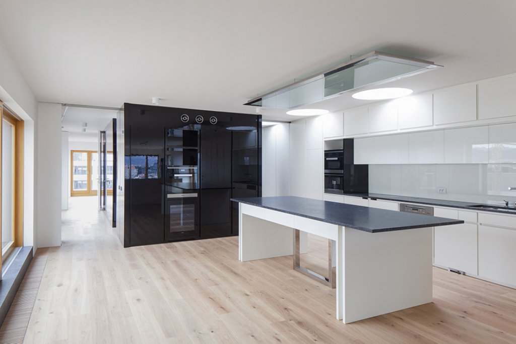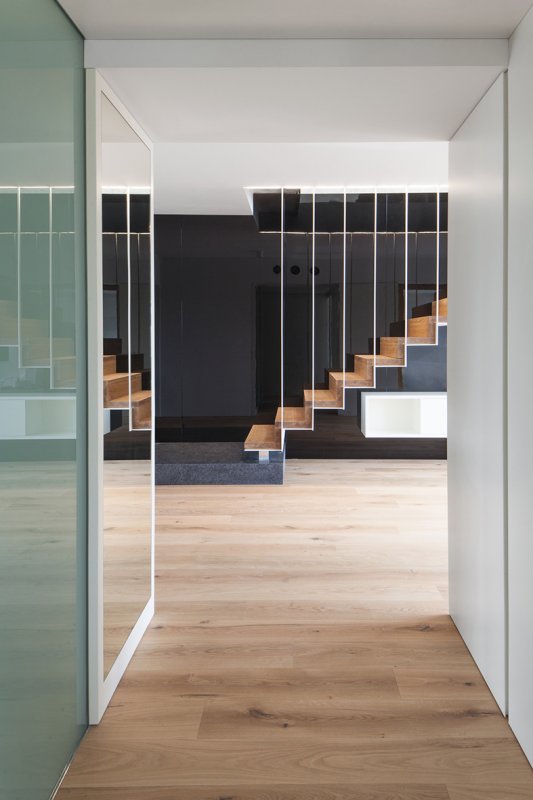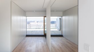 Byt se stává pozorovacím místem, do kterého tyto fenomény přirozeně vstupují... Dům Z3 vznikl podle vítězného konceptu švýcarského atelieru EM2N v rámci soutěže na zástavbu Rohanského ostrova pod názvem River Gardens. Projekt bytu byl započat ve stavu „shell and core” a zadáním byl prostor pro čtyřčlennou rodinu. Byt je mezonetového typu, umístěný v posledních dvou patrech domu. Velkorysé horní patro bytu bylo vzhledem k vazbě na terasy, určeno jako obytné, spodní jako ložnicové. Centrem bytu je nové schodiště, které vertikálně proniká do horizontálního obytného patra. Principem přístupu bylo zachovat celistvost prostoru s průhledy na městské scenérie. Zázemí bytu jako koupelny, šatny, kuchyňská linka byly uspořádány do bloků, které byly umístěny do prázdného půdorysu. Před instalací servisních bloků byla podlaha pokryla dubovými světlými prkny. Blokům byly přiřazeny základní barvy – bílá a černá. Tyto servisní bloky byly doplněny několika solitérními kamennými prvky jako je krb, kuchyňský ostrov nebo zábradlí schodiště.