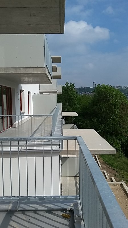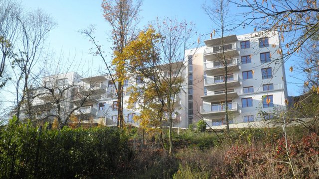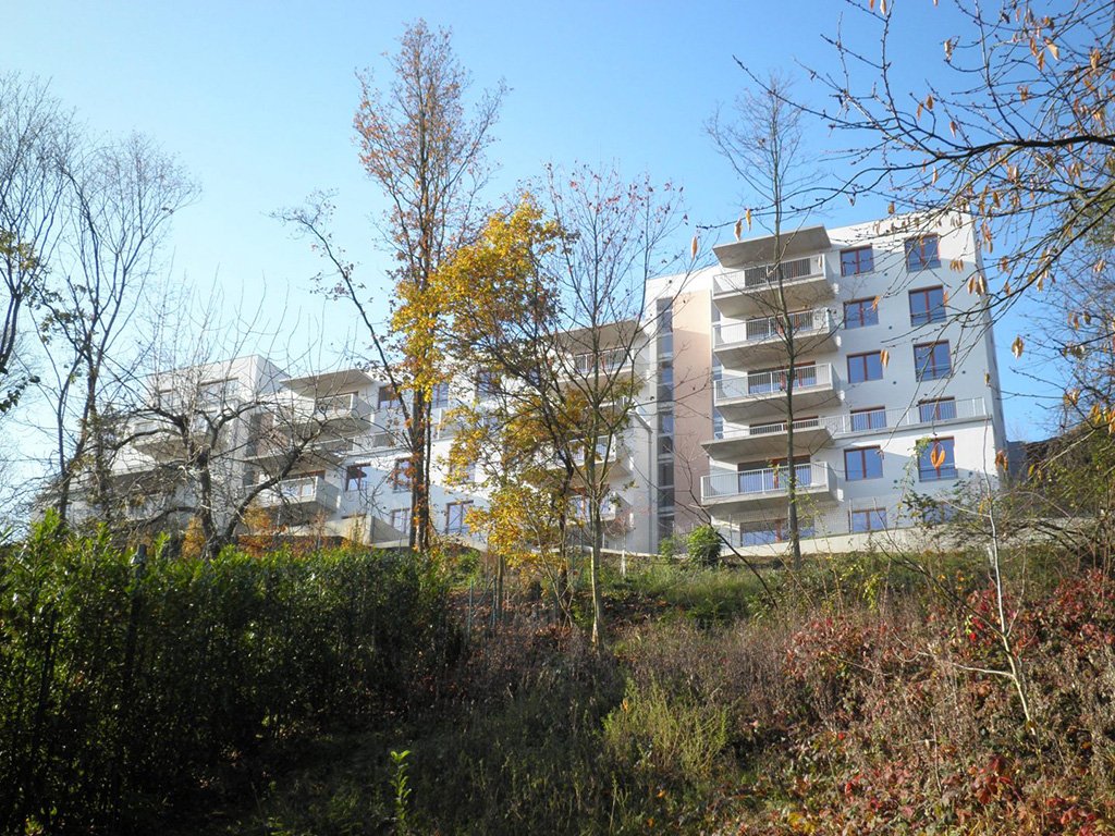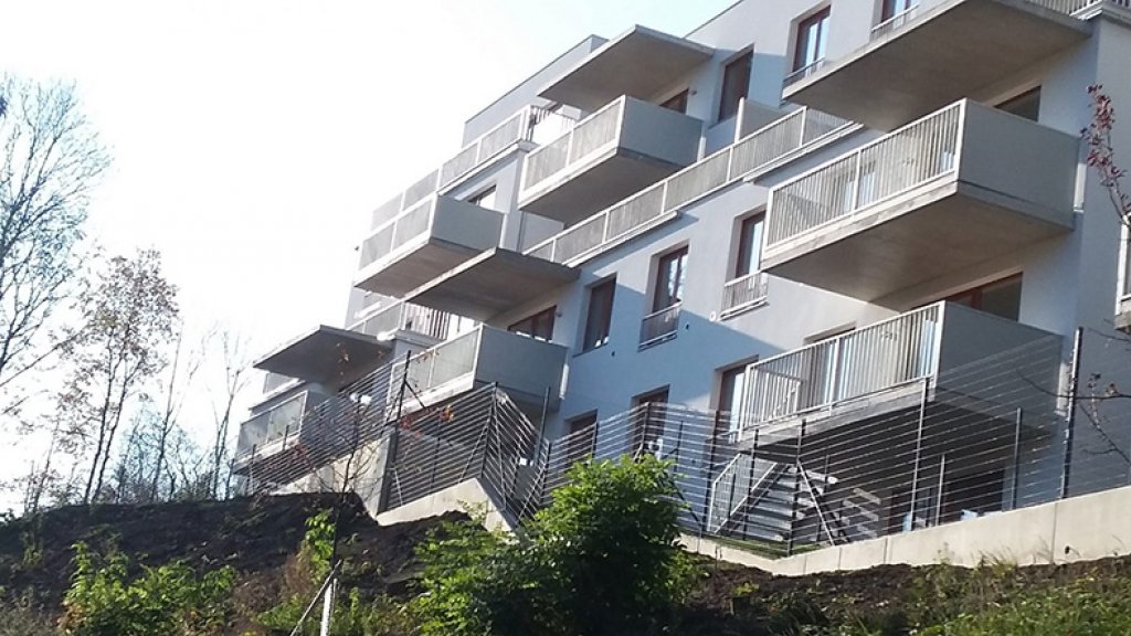 Terasový bytový dům umístěný ve svahu s problematickou geologií a s náročným technickým řešením pro zakládání.