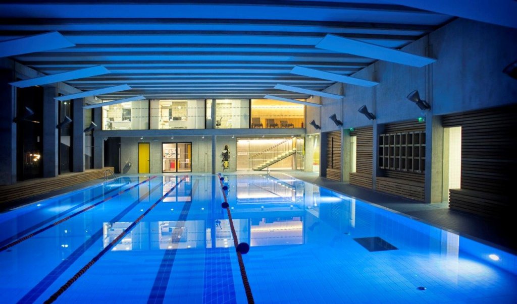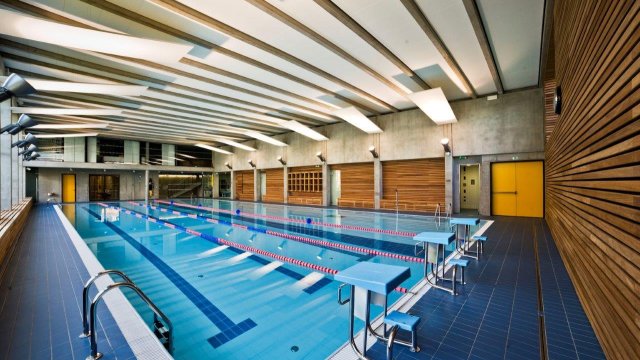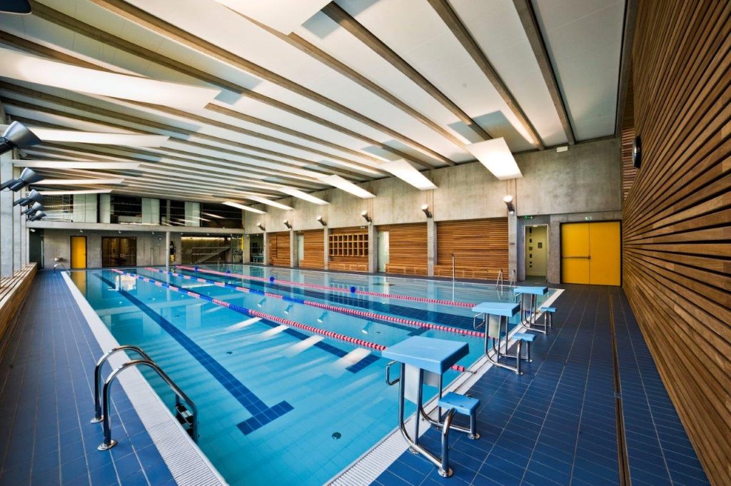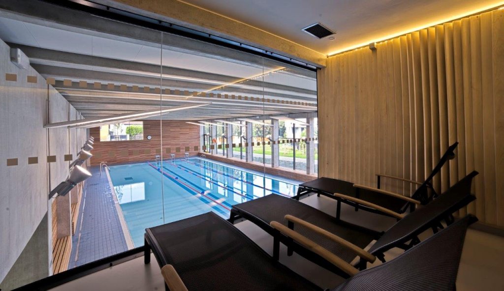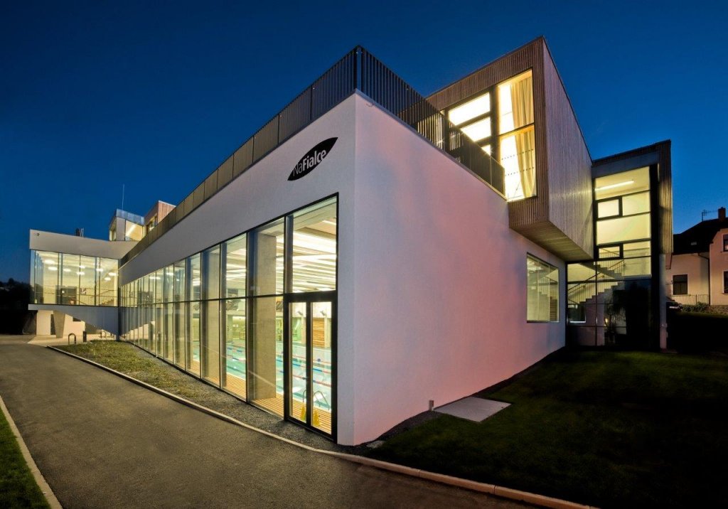 Svažitost pozemku se podařilo využít zapuštěním části objemu stavby tak, že z jihu od Mánesovy ulice tvoří nízkou hmotu členěnou do menších objemů, ze severu pak budova směrem k bytovým domům více vystupuje a tvoří přechod obou urbanistických měřítek. Exteriérem se stavba rozděluje na jednotlivé konstrukční a funkční celky: hmotu s bazénem, nad ní dřevostavby s modřinovou fasádou, v centru komunikační část se vstupními prostory a víceúčelovým sálem s přilehlým foyer a navazující hmotou tělocvičny, jež je z Mánesovy ulice kryta konstrukcí (přímkovou plochou), jež porůstá popínavou vegetací.