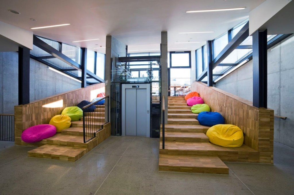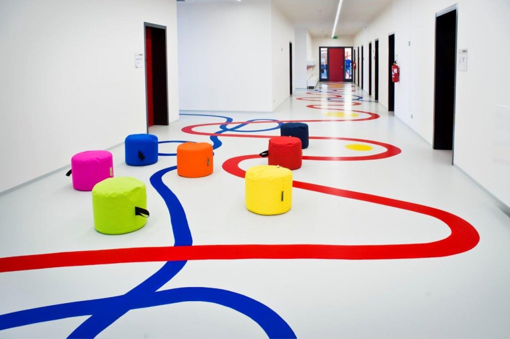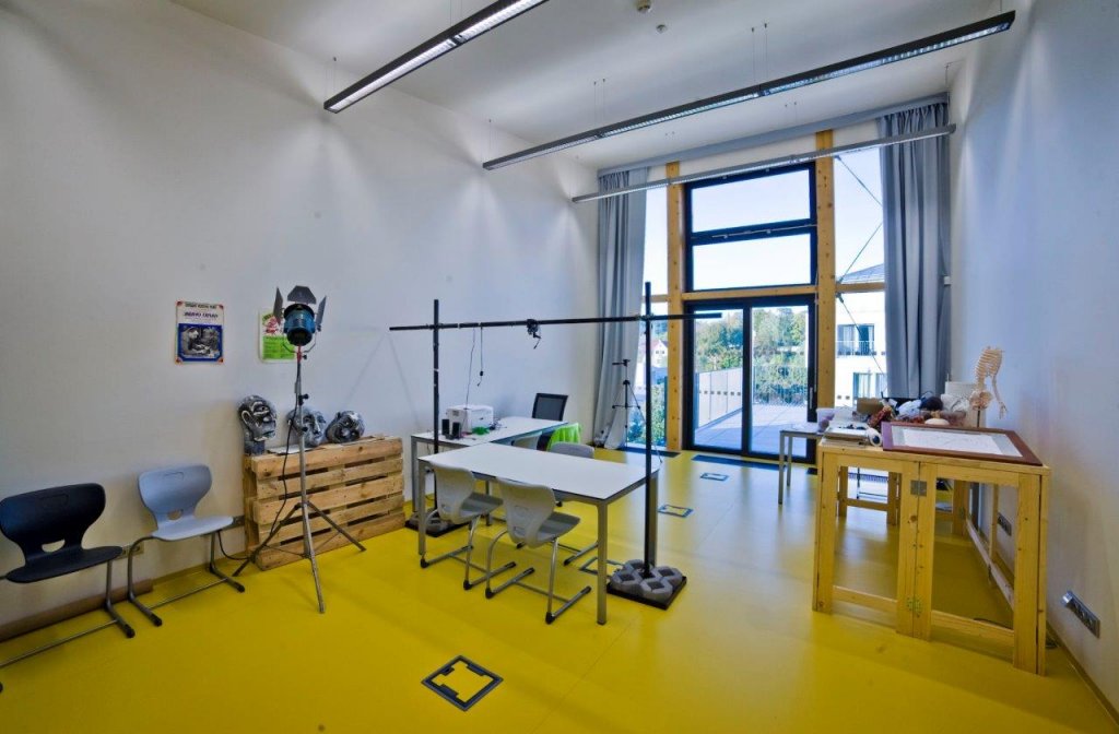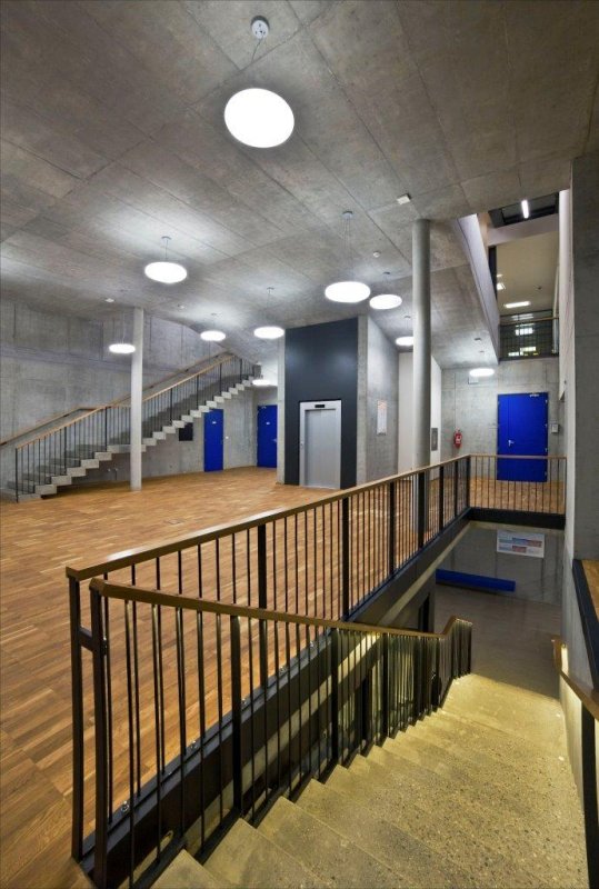 Uvnitř prostory svůj charakter přenášejí i na použité materiály a konstrukce. Konstrukce jsou v co největší míře přiznané a formují společně s doplňujícími materiály a povrchy zážitek z interiéru. Syrovost betonových konstrukcí je zjemněna dřevěnými nebo keramickými obklady či barevnými akcenty, které prostupují v různých formách v čistých odstínech celou stavbu.