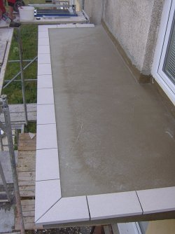 Izolování – na vyspádovanou plochu balkonu, včetně jeho čel, provádíme stěrkovou izolaci Cemix Hydroizolační stěrkou 1K, většinou ve dvou vrstvách a v celkové tloušťce cca 2 mm. Ta vytváří trvale pružnou izolační vrstvu ukončenou na hraně zabudované okapnice. Je nutné dodržet technologickou přestávku mezi nanášením jednotlivých vrstev izolace. Pro překlenutí přechodu mezi podlahou a stěnou vkládáme do izolační vrstvy Cemix Pružnou těsnící pásku.