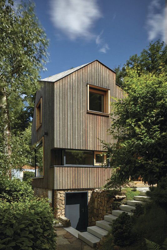 „Návrhy domu a interiéru probíhaly ‚ruku v ruce‘ – současně a tak, abychom dokázali dobře využít každý centimetr místa, který nám původní chatička vymezila,“ říká architektka Klára Vratislavová. A tak se na nevelikou plochu přibližně 5 × 8,5 metru vešla jídelna a obývací pokoj v jednom s velkorysým výhledem na vodní hladinu, prostorné zádveří s lavicí k přezouvání, koupelna, samostatná toaleta, komora, a dokonce i technická místnost. V patře pak vznikla jedna větší a jedna menší ložnice a také šatna. „Patro jsme vymýšleli ‚naruby‘, než jak je zvykem. Nejdříve vznikaly potřebné prostory pro ložnice a pak jsme střechu ‚okrajovali‘ tak, aby hmota domu byla co nejmenší. Naším cílem bylo navrhnout stavbu, která se pokorně zapojí do zeleného svahu nad vodní hladinou, kde stojí převážně skromné staré chatky,“ doplňuje Klára Vratislavová.