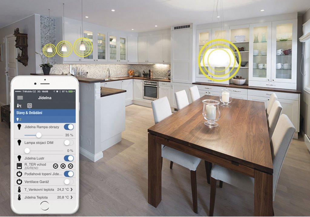 Už jste přemýšleli, kolik vypínačů bude třeba v jednom obytném prostoru pro ovládání osvětlení v obývacím pokoji, jídelně a kuchyni? Kde budou přesně umístěny a z kolika míst budou světla ovládána? Počet a umístění vypínačů se nejlépe stanoví až po „zabydlení”. Lze se inspirovat novým způsobem ovládání osvětlení s využitím světelných scén. Ke vchodu do místnosti se umístí pouze jedno 4bodové bezdrátové tlačítko, ze kterého se vyvolá požadovaná úroveň osvětlení jednotlivých světel tak, jak si uživatel přeje. Lze si vybrat tu nejvhodnější atmosféru pro sledování televize, stolování nebo četbu. Při odchodu z místnosti se centrálně zhasnou všechna světla, některá pomocí stmívací funkce i se zpožděním, a např. při delším stisku tlačítka se zároveň spustí rolety. Nastavenou světelnou scénu je možné kdykoliv upravit např. ze smartphonu. Pro ovládání světel z více míst se do místnosti doplní patřičný počet RF tlačítek tam, kde postupně vznikají požadavky na ovládání.