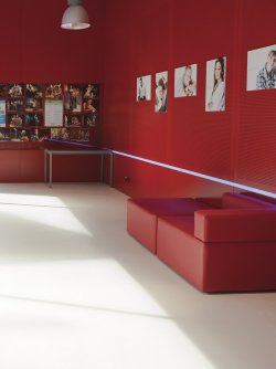 Výrazným činitelem ve vstupních prostorách je odvážné červené zbarvení, které symbolizuje sílu mladé krve a energii dramatického umění. Exkluzivitu divadelního a společenského prostoru doplňuje vedle prosklené výtahové šachty a pásového okna v patře třeba i vtipný lineární světelný proužek ve stěnách. Logicky velký význam pro celkové harmonické vyznění sehrála volba typu podlahy – i v tomto případě samonivelační cementové finální stěrky SikaDecor®. Ta svou jednolitostí celkový dojem umocňuje a vnáší sem nesporný nádech noblesy a výjimečnosti.