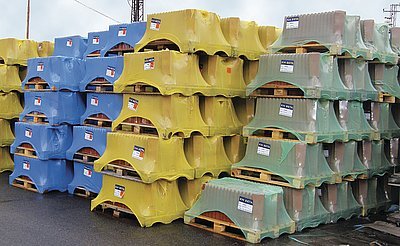 U protisněhových tašek složených na paletě jsou hrany betonových prstenců dotykovými místy, které jsou pak při dopravě a manipulaci náchylnější k poškození – v minulosti tak docházelo k odírání barvy i k mechanickému poškození. Proto výrobce KM Beta a.s. nyní každý prstenec protisněhové tašky opatřil krytkou z recyklovaného plastu, která chrání betonový výstupek před poškozením a protisněhové tašky tak cestují jako v bavlnce.