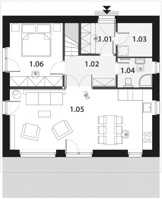 1. NP tvoří společenskou část domu. Obsahuje hlavní obytnou místnost s kuchyňským a jídelním koutem, pokoj, koupelnu a technické zázemí domu. Variantní řešení nabízí vytvoření samostatné kuchyně a možnost jiného využití pokojů (ložnice, pracovna, pokoj pro hosty či bydlení seniora).