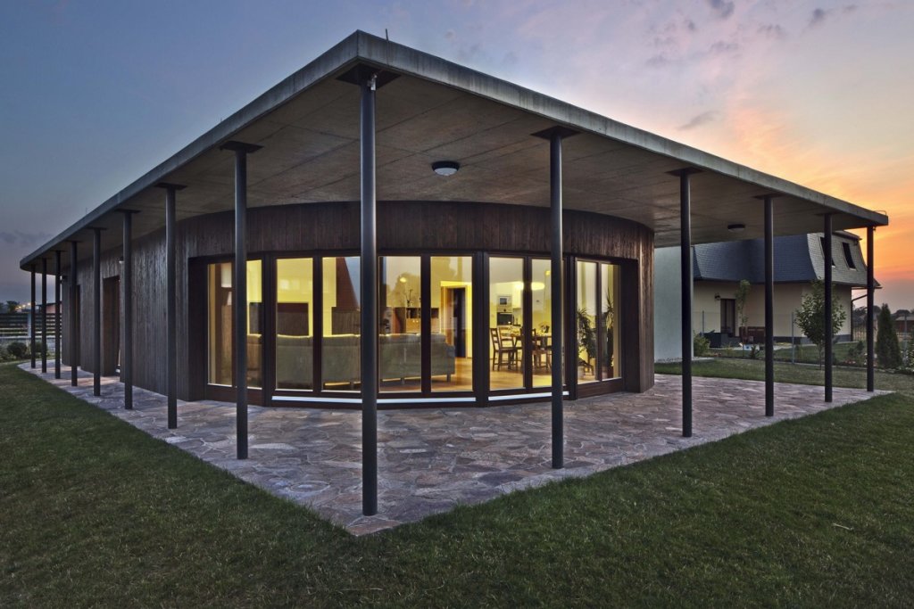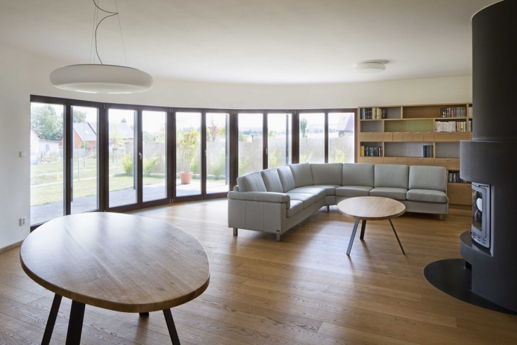 Dům je navržen na půdoryse protažené elipsy, která umožnila vymezit velký hlavní obytný prostor příjemných proporcí. Obloukové ukončení symbolicky navozuje rodinný kruh, místo, kde se členové rodiny potkávají, kde lze posedět u krbu. Ten svým elipsoidním tvarem koresponduje s tvaroslovím domu a stává se jakýmsi jeho středobodem. Je pomyslným ukončením podélné osy, která dále vymezuje paralelní linii komunikace – středovou chodbu, ze které se vstupuje do jednotlivých pokojů.