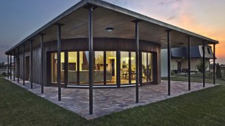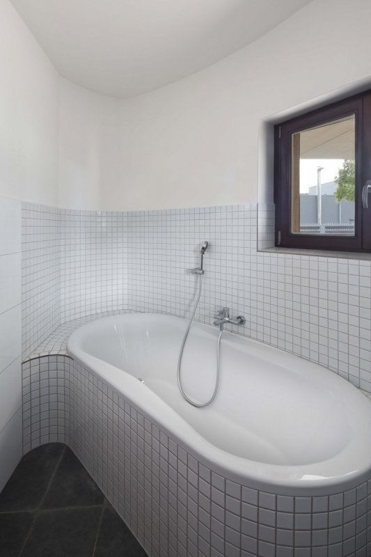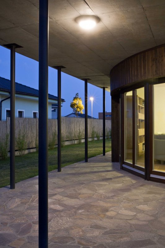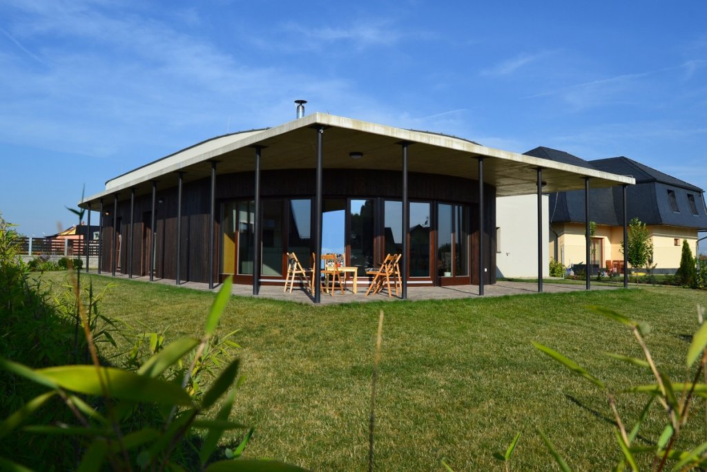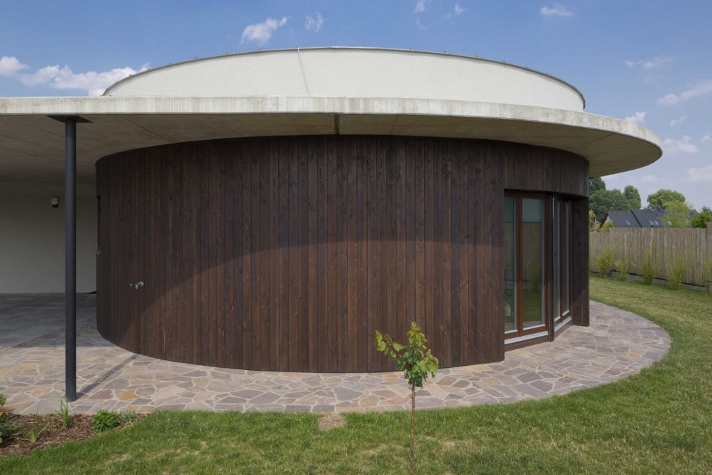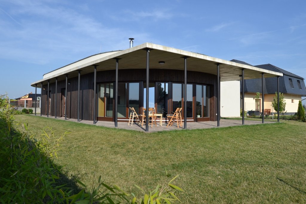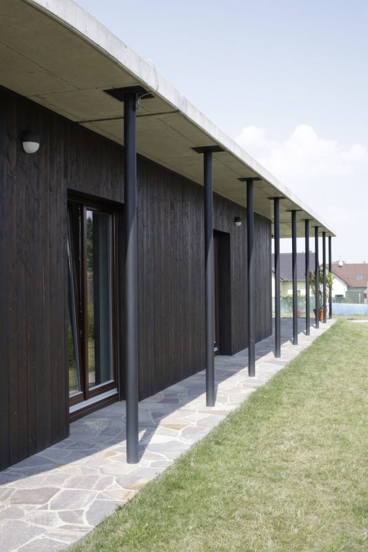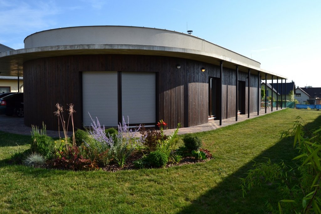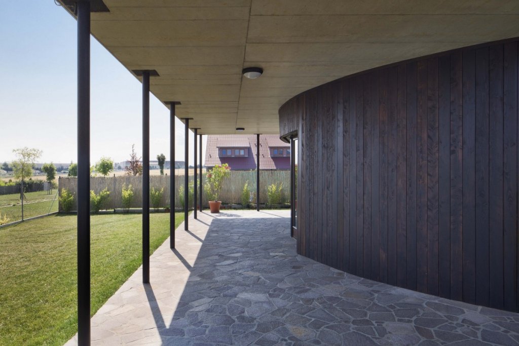 Kamenná dlažba je přechodem mezi trávníkem a vstupem do pokojů a podtrhuje přírodní ladění domu, kdy je v interiéru i exteriéru použito dřevo - dub, resp. modřín. U vstupní části pak protažení střechy umožňuje kryté parkovací stání až pro dvě auta . Střecha zároveň chrání modřínový dřevěný obklad, který je kotven do keramického zdiva. Střecha ve tvaru protažené elipsy je konstruována tak, že umožňuje vytvoření zelené střechy s extenzivním souvrstvím ze sukulentů a travin.