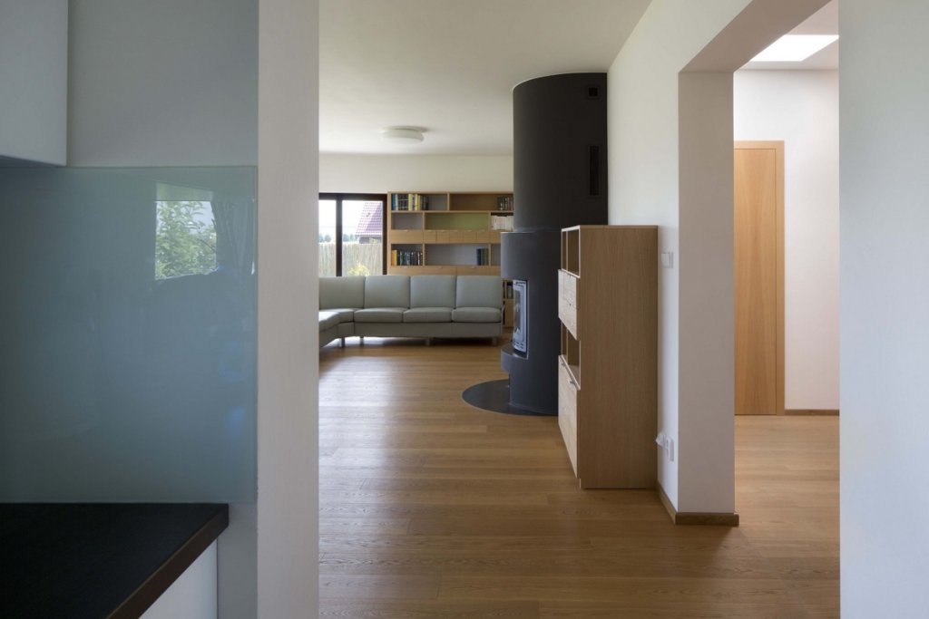 Dětské pokoje mají příjemnou, téměř čtvercovou proporci, na což byl při navrhování kladen důraz. Linie chodby je prosvětlena shora třemi světlíky s mléčným zasklením. Lomené světlo v centru dispozice vytváří pocitově příjemnou atmosféru. V této ose je veden také rozvod teplého vzduchu, který je distribuován pomocí ventilátoru z tělesa krbu. Veškeré obytné místnosti jsou natočeny k jihu nebo východu. Jsou tedy osluněny a před nepříjemným přehříváním v létě je ochraňuje kšilt domu – betonová markýza. Ta se rozšiřuje u obývacího pokoje a vytváří zde prostor pro venkovní posezení s terasou.