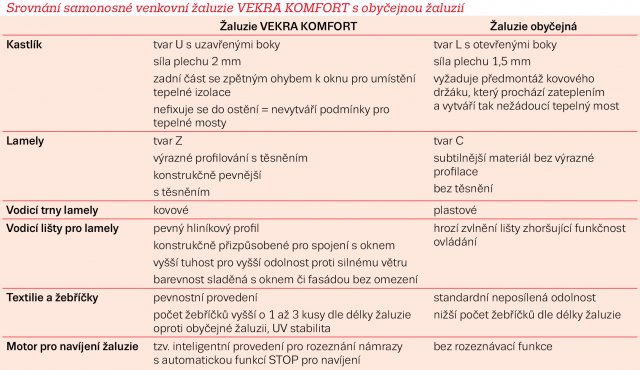 - Celý systém, včetně lamel žaluzií, má v souhrnu o cca 40 % vyšší hmotnost, než mnohé jiné výrobky na trhu. Důvodem je silnější plech na kastlíku, kovové vodicí trny, ale také například vyšší počet spojovacích žebříčků. Díky tomu bude VEKRA KOMFORT fungovat dlouhé roky bez nutnosti servisu, vydrží silný vítr (dle typu a šířky lamel, např. 68 km/h pro variantu KOMFORT a šířku 3500 mm) a časté používání. Není proto divu, že na celý samonosný systém venkovního stínění dává výrobce pětiletou záruční dobu.