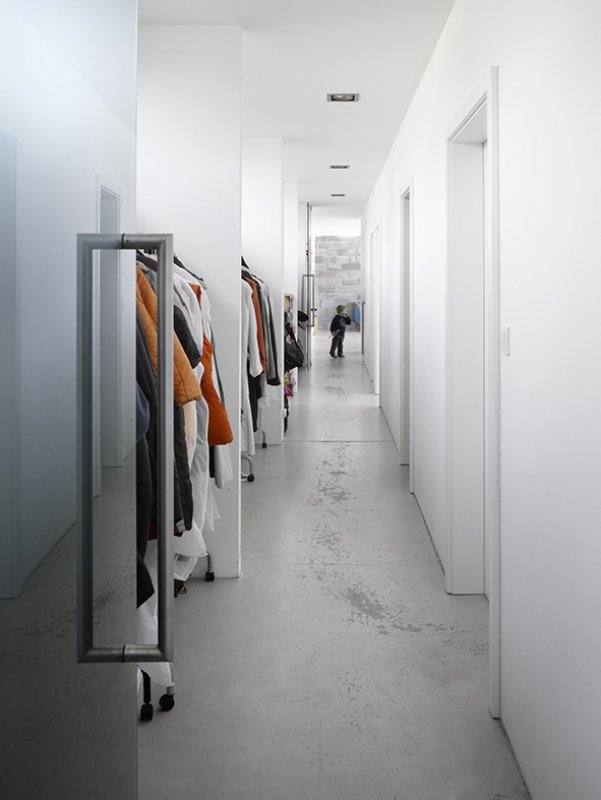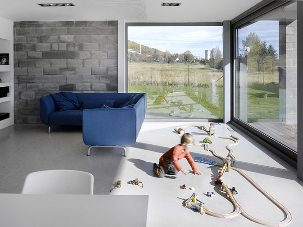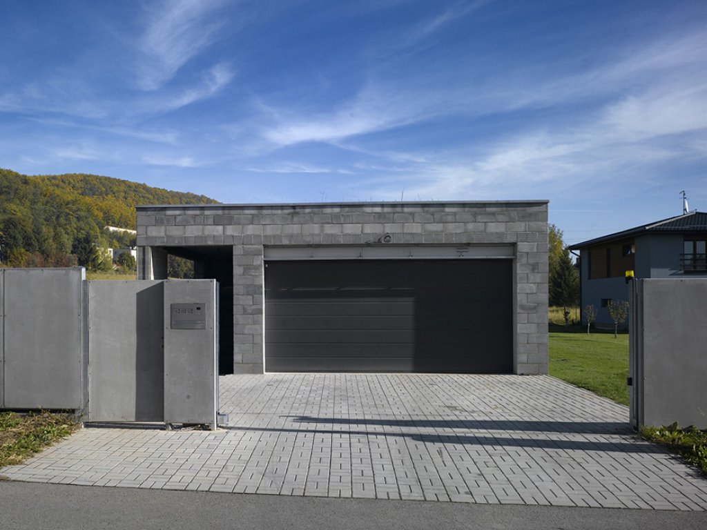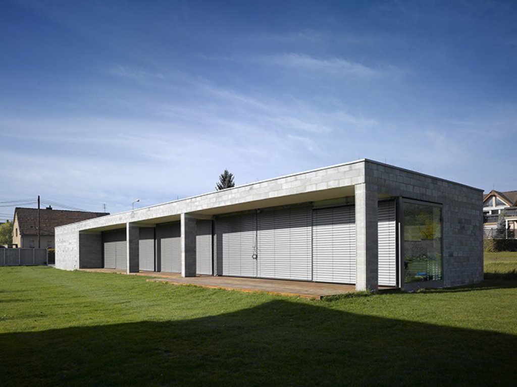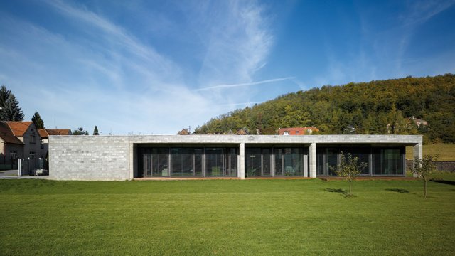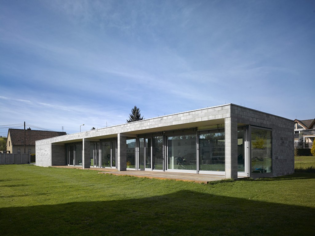 Dům je koncepčně navržen jako přízemní jednoduchý protáhlý hranol z betonových pohledových tvárnic. Plná zděná hmota je směrem do zahrady odlehčena ustoupením proskleného průčelí, které vytváří krytý prostor pro terasu.