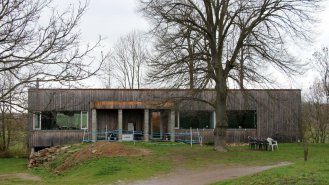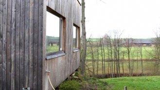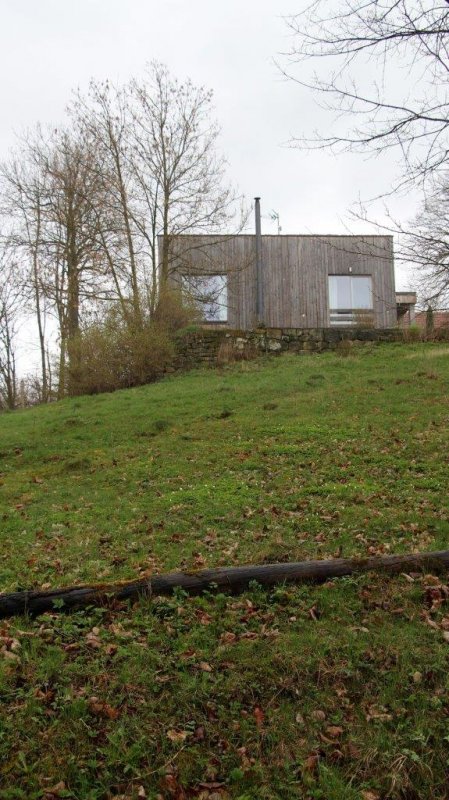 Jednopodlažní dřevěný dům pro mladý pár s dětmi, postavený na okraji vesnice s výhledem do volné krajiny.