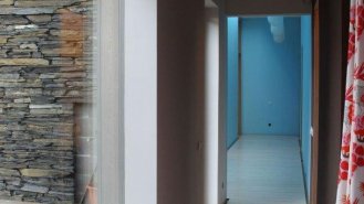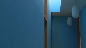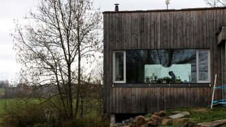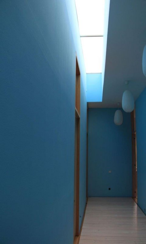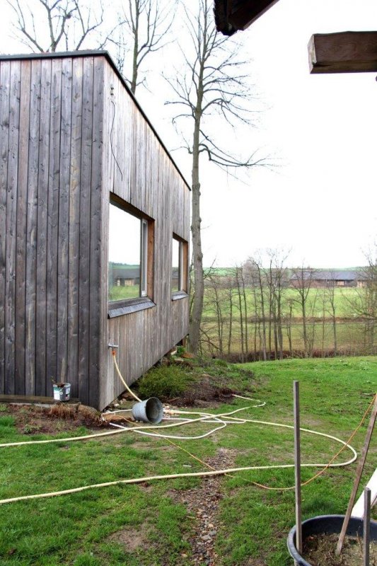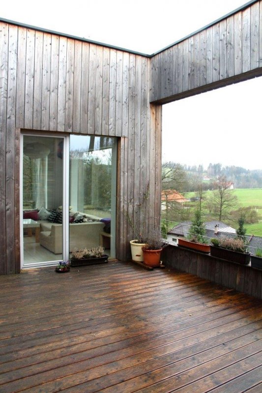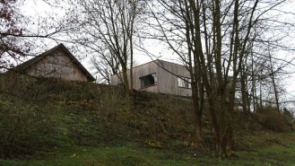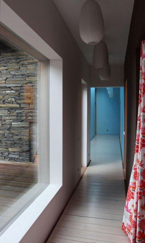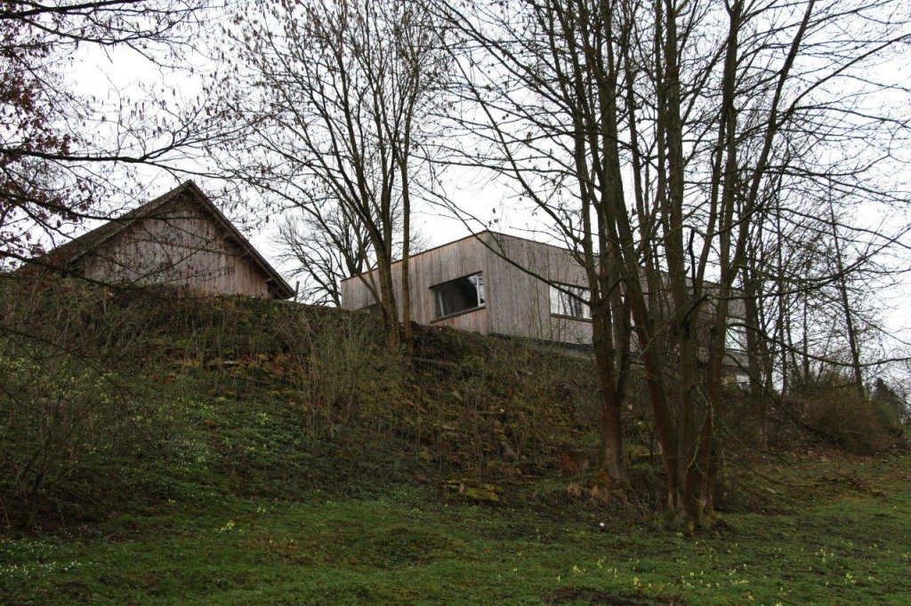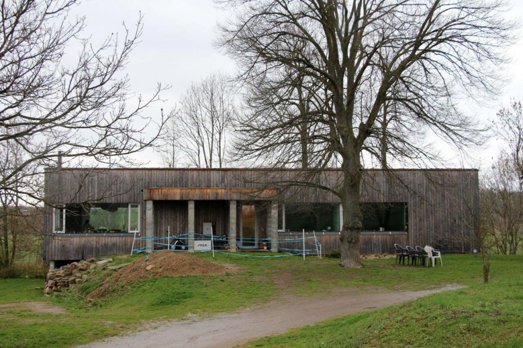 Na pozemku byly zbytky bývalého statku, ze kterého chtěli majitelé zachovat klenuté kamenné sklepy. Masivní kamenná podezdívka tak byla doplněná o lehké dřevěné obytné patro. Kuchyně, jídelna i obývací pokoj jsou spojené do jedné velké místnosti. Naopak dětské pokoje a ložnice rodičů jsou v oddělené části domu. Mezi nimi je skrytá ještě jedna speciální místnost. Zvenku do ní není téměř vidět, je bez střechy, s terasovými prkny místo podlahy a s ohromným “oknem” (nezaskleným) přes celou jednu stěnu. Je to nejoblíbenější pokoj z celého domu. V létě je dostatečně stinný během dne aby tu děti mohly spát v kočárku ale večer sem svítí zapadající slunce. V zimě si tu děti staví sněhuláky.
