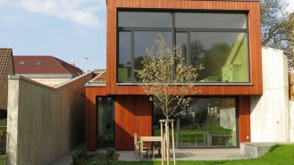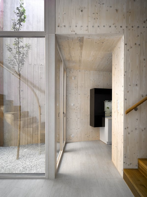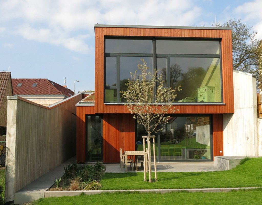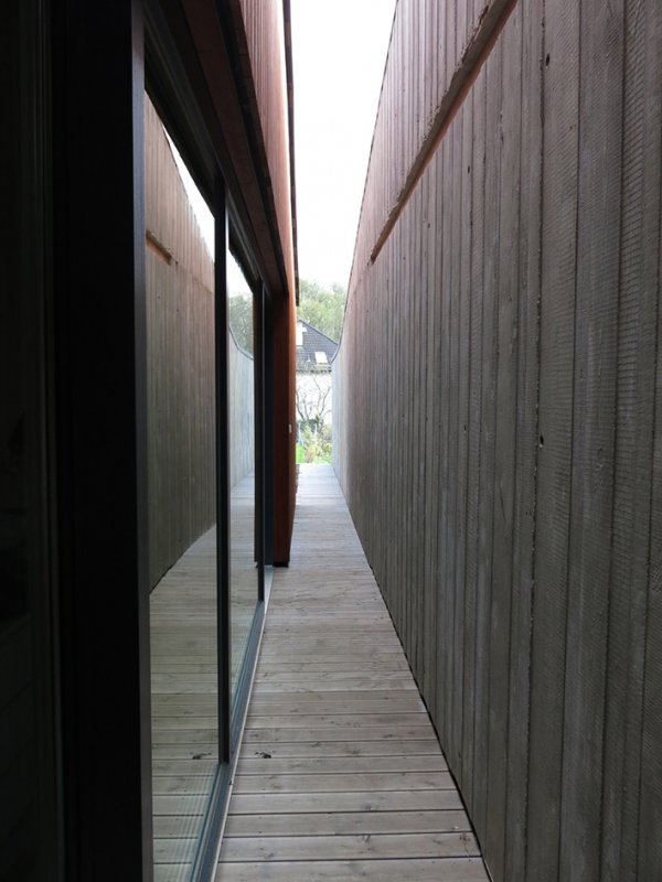 Pohybujete se v horách, skály se zdvihají, cesta krčí v proláklině mezi kopci. Zastavíte uprostřed a rozhlédnete se! Tam a zpět. Nedá se jít jiným směrem. Nevíte, co Vás čeká. Jaké překvapení, jaké taje. Skály se rozestupují, zarůstají do země, vítá Vás slunce. Otvírá se krajina. Prošli jste úžinou! Do jiného světa. Dům, jehož pozemek měří v nejužším místě pouhé 4 m. Dům, jehož vysoké stěny kopírují krajinu a reflektují skály Prokopského údolí! Dům, který zaplnil zbytkový prostor „přesýpacích hodin”! Dům, který odděluje jižní zahradu od ruchu velkoměsta! Dům, v jehož srdci se ocitáte vytržen z kontextu okolního světa! To je Dům v úžině!