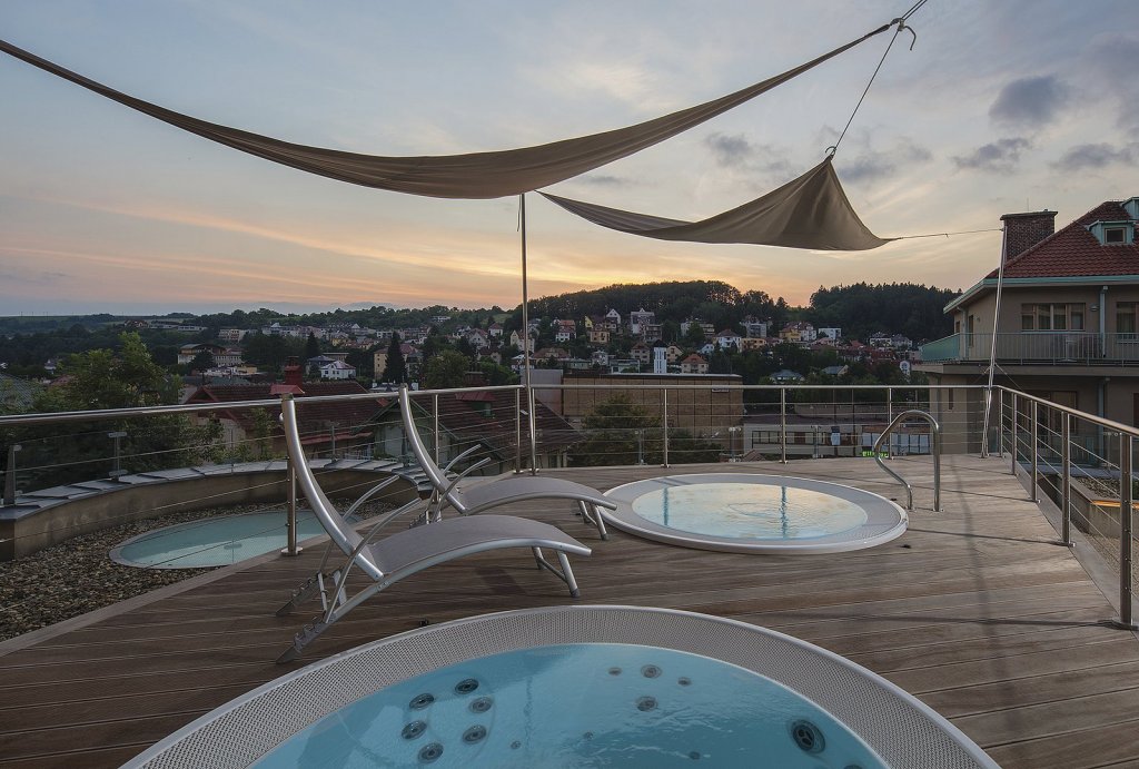 Na milovníky netradičních lázeňských zážitků čeká také nová relaxační zóna se dvěma vířivkami přímo pod širým nebem, které si hotel nadělil v loňském roce ke svým osmdesátým narozeninám. Vířivky inspirované plavbami Alexandra Velikého, a proto zabudované do pódia ve tvaru lodní přídě, dvě stínící plachty evokující plachty lodi, se kterými si pohrává vítr, výhled na jezírko s lekníny a na záhony s bambusy a levandulemi, i jedinečný panoramatický rozhled na vyhlášené lázeňské město.