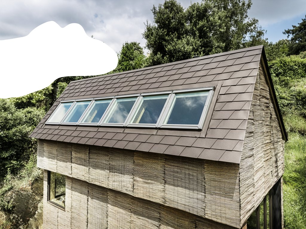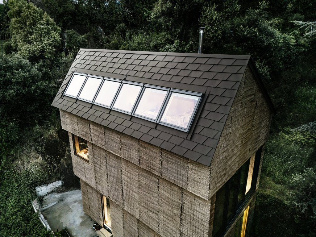 Vnější plášť domu kombinuje netradiční, avšak udržitelný materiál – vrbové rohože montované přes černou izolační fólii. Výsledkem je organický výraz fasády, která plynule splývá s okolní vegetací. Kontrast i souznění zároveň zajišťuje střešní krytina z falcovaného šindele v hnědém odstínu označeném P.10 oříšková, se zárukou 40 let na materiál i stálobarevnost. Zkušený řemeslník Philippe Iacono di Cacito při její pokládce čelil nejen asymetrickému sklonu střechy a přerušení šindelové plochy střešním oknem, ale i architektonickému požadavku na skryté odvodnění v čelní partii. Výsledné řešení zajišťuje funkčnost při zachování čisté estetické linie – bez viditelného žlabu z ulice.