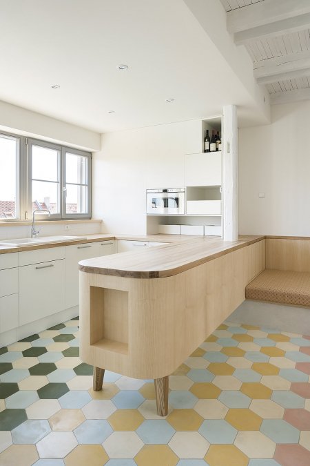 Při pohledu na fotografie však většinu z nás nejvíce nadchnou interiéry. Designéři, přirozeně v úzké spolupráci s majiteli, kteří vyjádřili své preference a nad návrhy mnohokrát diskutovali, naplnili vnitřní prostory pastelovými barvami a na míru vyrobeným nábytkem, který svým vzhledem, tvarem i výběrem barevných odstínů připomíná první polovinu minulého století. Vše vkusně doplňují vybrané podlahové krytiny, například hexagonální dlažba v kombinaci tmavě zelené, bledě modré, bílé a hořčicově žluté. Významnou roli hrají ve výsledném dojmu i použité přírodní materiály (dřevo, keramika) a vybrané otvorové výplně, tedy okna, vyplněná romantizujícími příčkami. Vše je sladěno do posledního detailu, avšak nepřeplněno. Prostory tak působí volným, až svobodným dojmem a čekají pouze na dovybavení svými majiteli, kteří jim dodají poslední tečku.