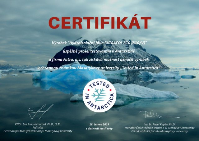 Doposud jen 9 firem se může pyšnit certifikátem „Testováno v Antarktidě“. Společnost Fatra, a.s. je jednou z nich. Náročné podmínky antarktického podnebí, dlouhodobé a intenzivní testování, to vše musí podstoupit výrobek, který se uchází o zisk tohoto certifikátu.