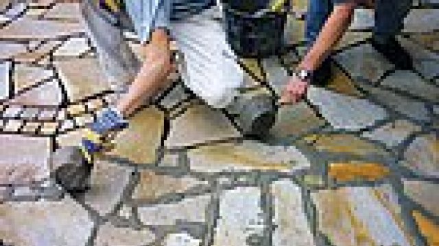 Ploché kameny spojí s podkladem Baumit lepidlo na kameny (Baumit Steinkleber) – maltová směs s obsahem trasu zabraňujícího tvorbě výkvětů. Spáry se vyplňují Baumit drenážní spárovací maltou (Baumit PflasterFugenmörtel) nebo esteticky nepřekonatelnou Baumit přírodní spárovací hmotou (Baumit NaturFuge).