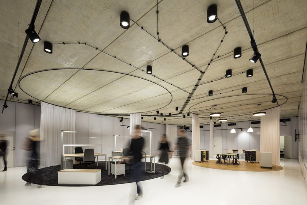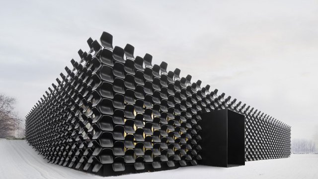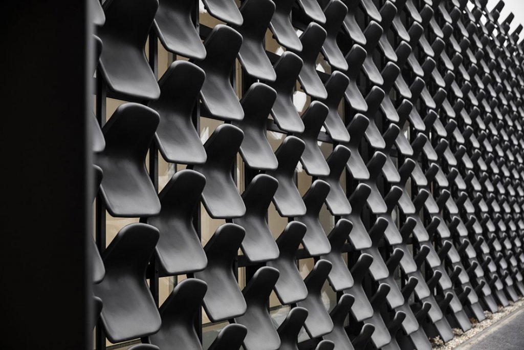 Jednopodlažní objekt nevalné estetické kvality získal novou, snadno zapamatovatelnou tvář tvořenou více než devíti sty černými plastovými sedáky. Abstraktně pojatá fasáda zároveň funguje jako reklamní poutač na firmu samotnou. „Jedná se o základní formu interiérové židle Vicenza, kterou investor standardně dodává, s tím rozdílem, že jako materiál byl použit černý granulát pro venkovní použití – je tedy odolný proti vlivům počasí, zejména UV záření,” popisují architekti. Druhou rovinou návrhu je interiér, který sestává ze dvou částí: showroomu a kanceláří se zázemím pro zaměstnance. Vnitřek stavby byl kompletně očištěn. Do abstrahovaného prostoru jsou vloženy tři kruhové galerie reprezentující tři odlišné segmenty výroby – školní nábytek, kancelářský nábytek a designové kusy. Kruhové výřezy jsou vymezeny bílými textilními závěsy na celou výšku prostoru, které lze dle potřeby uzavřít, nebo ponechat otevřené. Interiér výřezů představují tři odlišná prostředí, kde materiál podlahy, způsob osvětlení i barva světla jsou zvoleny tak, aby odpovídaly přirozenému prostředí, pro které je nábytek určen. Meziprostory je možné vyplňovat různými solitéry, lze je využívat jako konferenční místnost zaměstnanců nebo k posezení s klienty. Celý prostor funguje na principu galerie, kterou je možné jednoduchým způsobem přizpůsobovat aktuálním potřebám. Kanceláře pro zaměstnance jsou zachovány stávající po obvodu stavby a jsou sjednoceny šedým kobercem a bílou výmalbou.