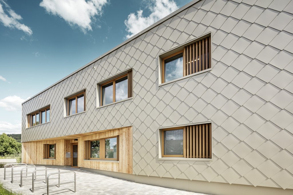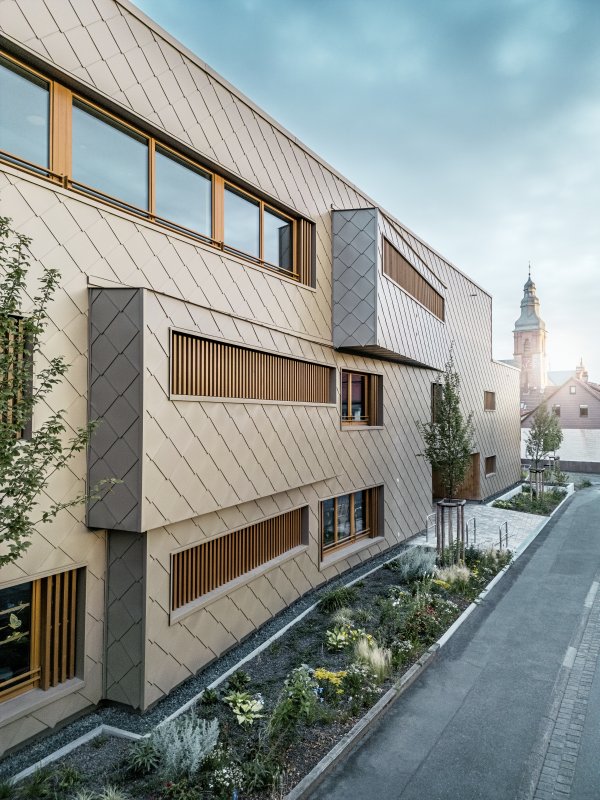 Klíčovým prvkem realizace je fasáda z 3500 bronzových fasádních šablon PREFA o rozměrech 44 × 44 cm. Tento fasádní systém byl zvolen záměrně – hliník je nenáročný na údržbu, odolný vůči všem povětrnostním podmínkám i nečistotám z nedaleké dopravní tepny. „Rozhodně jsme chtěli kovovou fasádu,“ vysvětluje architektka Claudia Härtner, která vedla projekt od počátečního návrhu až po realizaci.