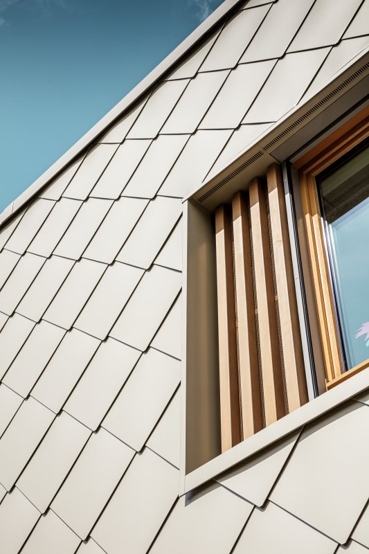 Instalace opláštění se chopila společnost ASA Schüßler, která fasádu realizovala na plné dřevěné bednění. Vysoká úroveň jejího klempířského řemesla je patrná zejména v místech arkýřových oken, kde se kosočtvercové šablony setkávají s pomocným krycím plechem PREFALZ.