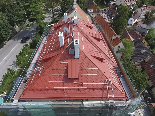 Mezi hlavními důvody, pro něž se investor rozhodl následovat rady oslovených realizačních firem, figurovala dlouhá životnost popisovaných hliníkových šablon a s tím spojená čtyřicetiletá záruka na materiál. Střešní krytina PREFA s optikou pálené tašky, která byla během českokrumlovské rekonstrukce uplatněna, zaujme rovněž vysokou odolností a nízkou hmotností (2,60 kilogramu na čtverečný metr), a tedy i snadnou manipulovatelností. Díky technologii „drážka v drážce” je i jednoduše integrovatelná do téměř jakéhokoli střešního systému. Hodí se proto i k pokrývání starších, ale funkčních krovů. Patentovaný systém falců a povrchová úprava P.10 metodou „coil-coating” činí navíc střechu mimořádně odolnou vůči povětrnostním vlivům včetně vichřic.