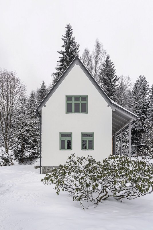 Chata s kamenným komínem, zelenou střechou a prosklenou zimní zahradou