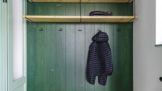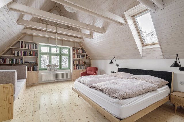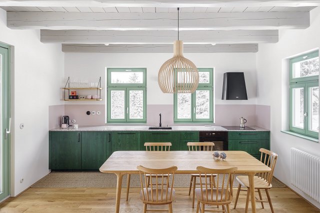 Jednoduše zařízené interiéry s vestavěným nábytkem (vyrobeným na míru dle návrhu Kateřiny Margoldové) a stěnovými obklady ze světlého dřeva lehce podtrhují a obohacují doplňky, jako jsou výrazná svítidla nad jídelním stolem a posezením v hlavní obytné místnosti nebo retro vypínače. Pozornost poutá též jemný vzor smrků na koupelnových stěnách. Do všeho vhodně zapadá zelené zbarvení okenních rámů, dveří či kuchyňských skříněk. Efektní je i kontrastní černá ocelová konstrukce schodiště s dřevěnými stupni. Architektka Margoldová, která je autorkou návrhu přestavby i interiérů, kladla důraz i na dostatek úložných prostor.