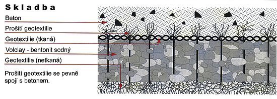 Rohože Voltex tvoří dvě polypropylénové textilie (tkaná a netkaná), které jsou patentovaným způsobem šití propojeny (obr. 1). Hustota šití je taková, že granule bentonitu jsou ve své poloze fixovány a nehrozí sesypání granulátu při svislé aplikaci.