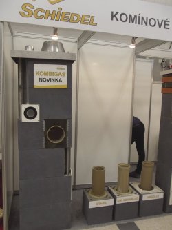Kde jsou kotle a kamna, jsou i komíny. Moderní komínový systém Schiedel Kombigas, současně pro kondenzační plynové kotle, krbová i peletová kamna, popisujeme na závěr: kromě jiného dvouprůduchová komínová tvárnice se dvěma šachtami, s integrovanou tepelnou izolací, broušenou ložnou spárou. Tenkostěnná keramická vložka 66 cm plus minerální izolace se systémem zadního odvětrání pro všechny druhy paliv. Plastová komínová vložka v tepelně izolované šachtě pro kondenzační spotřebiče.