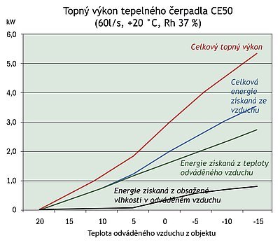 Celkový výkon získaný ze vzduchu stoupá rychleji při klesající teplotě odváděného vzduchu za současného zvyšování celkového výkonu tepelného čerpadla.