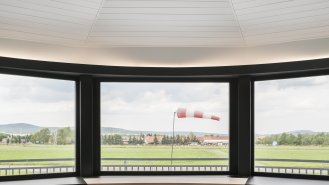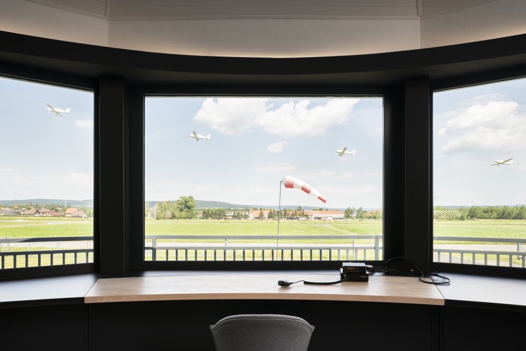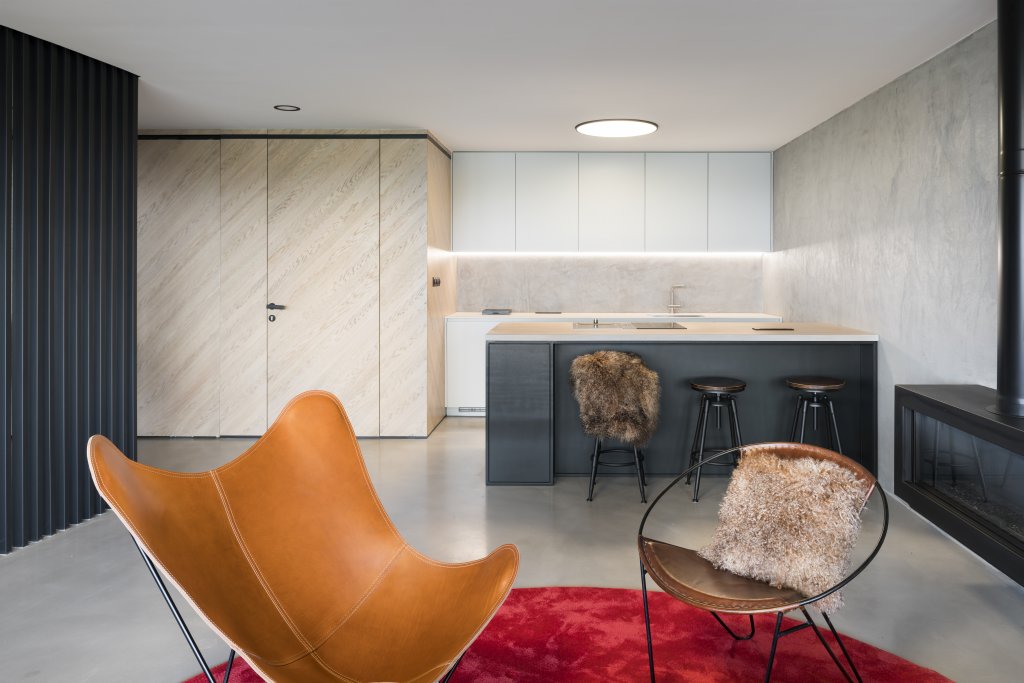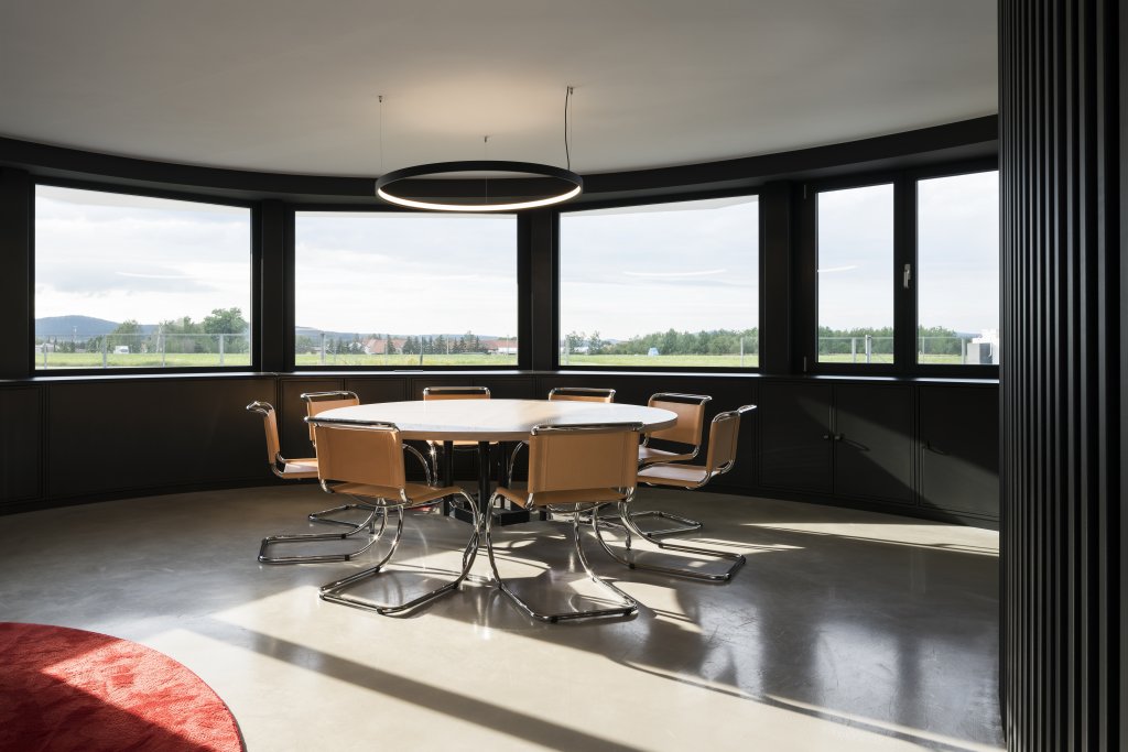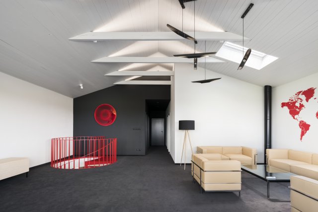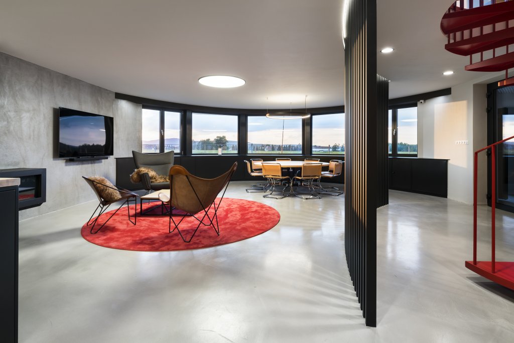 V přízemní části interiéru vytvořili architekti konzistentní otevřenou zónu, kterou pouze opticky rozděluje lamelová příčka v kombinaci s ocelovým točitým schodištěm. To je opatřeno výrazným červeným nátěrem, který vytváří specifickou atmosféru (červená je jediným výrazným barevným prvkem, který se několikrát opakuje v jinak zcela neutrálně laděném zařízení). Lamelová příčka je klíčovým prvkem přízemního prostoru, je zčásti transparentní, tudíž dovoluje průhled směrem k hale se zaparkovanými letadly. Zároveň slouží jako prostředek k tvorbě reprezentativního vstupu a také jako nástroj k vizuálnímu oddělení zádveří - napomáhá vytvořit dostatek soukromí v obytné části.