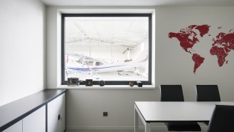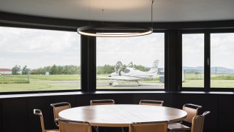 Majitelé revitalizovaného interiéru, energický manželský pár, jsou vášniví cestovatelé. A toto své hobby realizují nejčastěji z paluby ultralightu. Metamorfóza hangáru, konkrétně jedné jeho části - původní pozorovací věže pro leteckou kontrolu (cca ¼ hangáru) v obytné prostory byla tedy poměrně logickým vyústěním zájmů investorů. Požadovali tvorbu moderního a praktického prostoru, přáli si skloubit technické prvky a propozice s příjemným příležitostným bydlením či organizací společenských akcí. Zajímavostí je zachování funkce pozorovací věže ve chvílích zvýšeného letištního provozu, prostor je proto občasně využíván i správou letiště.