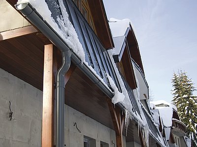 Následky sesuvu sněhu můžeme eliminovat umístěním žlabů i svislých svodů hluboko pod hranu střechy. Zvláště do horských oblastí je ideální stavebnicový okapový systém, který lze jednoduše demontovat a ochránit tak před poškozením v extrémních podmínkách. Okapové žlaby se spojují bajonetovými spojkami, které lze snadno opakovaně použít. Instalaci systému zvládne průměrně zručný kutil, nevyžaduje žádné speciální nářadí, není třeba šroubovat ani letovat, jednotlivé díly do sebe zapadají jako dětská stavebnice.