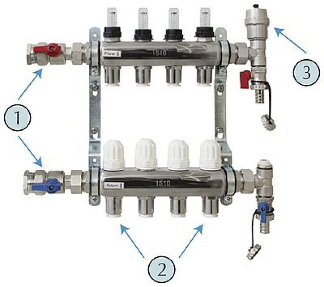 - nerezové rozdělovače topných okruhů pro 4–12 okruhů (obr. 1),