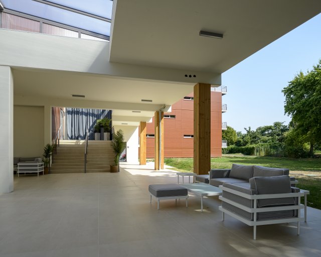 Každý z 28 nově vzniklých pokojů je plně klimatizován, má sociální zařízení a balkon s výhledem do tamního dvouhektarového parku. Konstrukce balkonu přitom není obvyklou součástí modulárních staveb. Dodavatel modulů však přišel s návrhem elegantního a inovativního řešení. Podlaha balkonu je spádovaná a izolovaná takzvanou EPDM membránou do vpusti. Pochozí vrstvu tvoří betonové dlaždice osazené do plastových terčů.