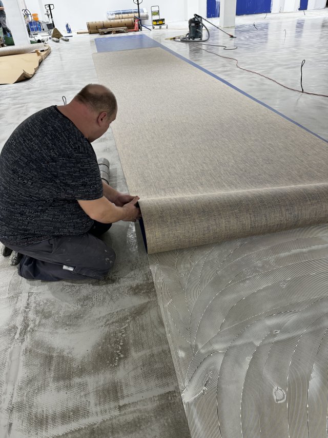 Betonový podklad byl poctivě naválečkován penetrací UZIN PE 360, disperzní penetrací vhodnou pro savé podklady, potěry a betonové podlahy. Celou plochu bylo potřeba nivelovat do 4 mm, zvoleným materiálem tak byla cementová stěrkovací hmota, UZIN NC 150 oblíbená samorozlévací podlahová stěrkovací hmota pro textilní a elastické podlahové krytiny. Při takovéto ploše se jednalo o několik tun materiálu, k přípravě tak byla zvolena míchací stanice s míchadlem WOLFF pro přípravu až 75 kg hmoty naráz. Práce pak utíká rychleji a napojování stěrky je jednodušší, navíc je tato stěrkovací hmota už po cca 3 hodinách pochozí.