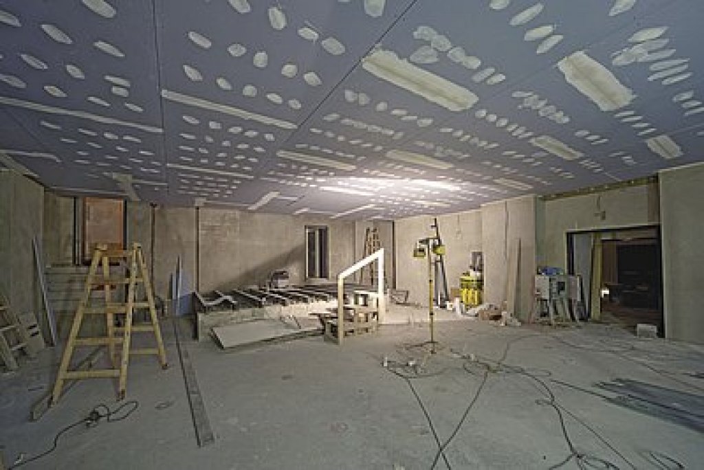 Vibrace se tak nemohou šířit do okolních stavebních konstrukcí domu. Stěny jsou od původních stěn odděleny volným prostorem. Pod stropní konstrukcí je speciálně navržený samonosný mezistrop s podvěšeným akustickým sádrokartonovým podhledem Rigips.