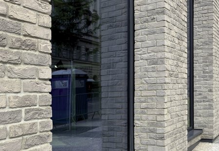 Zajímavý vzhled objektu dodává obklad z cihlových pásek Terca od společnosti Wienerberger. Cihlová fasáda byla realizována ve formě kontaktního zateplovacího systému, s povrchovou úpravou obkladovými pásky Terca AGORA AGAATGRIJS. Izolant tvoří minerální vlna s kolmým vláknem, která je celoplošně přilepena ke stavební konstrukci a spolu se základní vrstvou systému je zároveň k podkladu mechanicky upevněna systémem injektovaného kotvení. Obkladové pásky jsou k této základní vrstvě celoplošně přilepeny systémem oboustranného lepení „floating & buttering“ a následně vyspárovány. Všechny použité komponenty jsou součástí certifikované skladby zateplovacího systému Meffert Therm TERCA Wool.