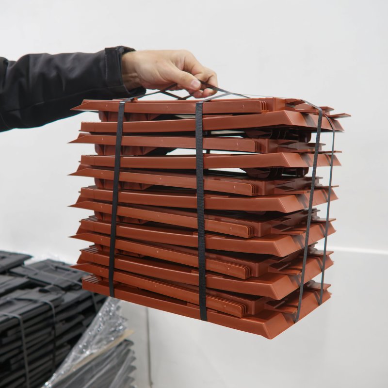 Používáme speciální směs polypropylenu, která umožňuje přidání recyklátu. Materiál je navíc upraven UV stabilizací a antioxidanty, což výrazně prodlužuje jeho životnost. Krytina je lehká, přesná a snadno se s ní pracuje.