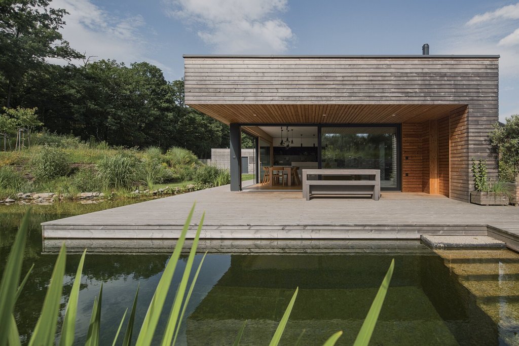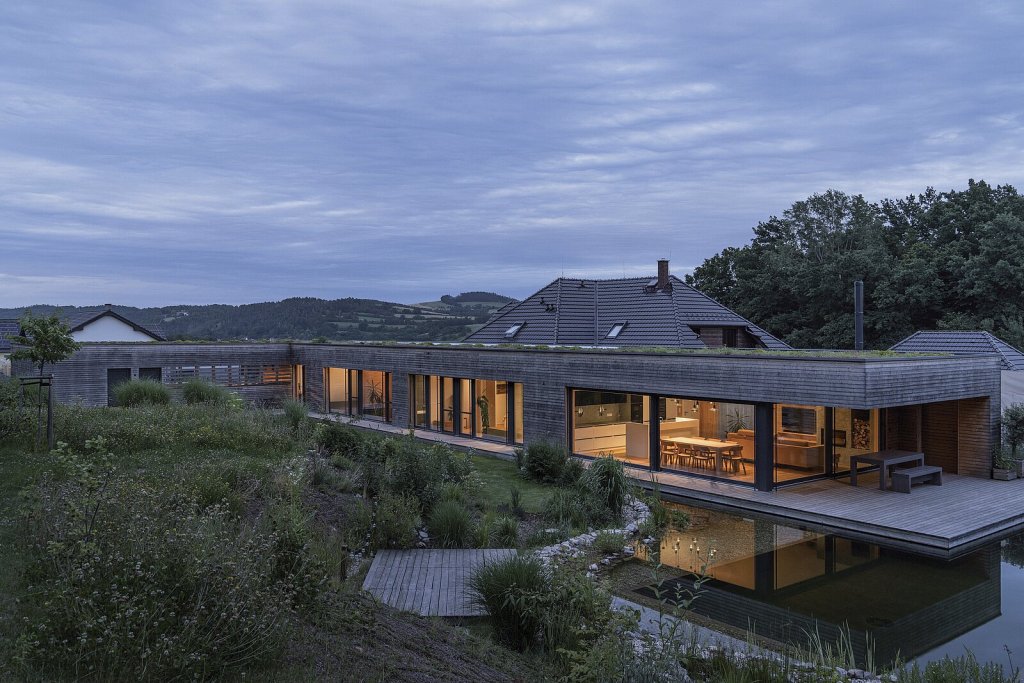 Dům ve tvaru písmene L chytře využívá mírného svahu a na ploše přes 250 m² nabízí pět obytných místností, dvě koupelny, šatnu a velkorysý obývací prostor s kuchyní a jídelnou. Vše propojuje dlouhá chodba lemovaná knihovnou, která působí jako klidná osa celého interiéru. Stavba se neotáčí k okolní zástavbě, ale otevírá se do vlastního nitra – do zahrady stoupající směrem k lesu. Ta není jen kulisou, ale přirozeným pokračováním obytných prostor. Jejím srdcem je koupací jezírko napojené přímo na dřevěnou terasu, které se stalo přirozeným centrem rodinného života.