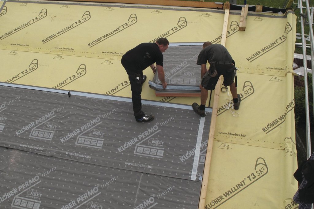 Nejsnazší a doporučovaná aplikace nadkrokevního systému Thermo-line je z venkovní strany a to buď přímo na krokve nebo na pevný, prkenný či deskový záklop nad krokvemi. V prvním kroku se položí parobrzda Wallint T3 SK2, což je třívrstvá kombinace tkaniny a fólie o plošné hmotnosti 160 g/m2. Ekvivalentní difúzní tloušťku této fólie reprezentuje vzduchová vrstva 3 m silná, tedy Sd = 3 m. Fólie Wallint T3 SK2 je extrémně odolná, plně pochůzná a je opatřena integrovanou dvojitou lepicí páskou. Ta slouží k bezpečnému docílení vzduchotěsnosti a souvislé parobrzdné vrstvy bez otevřených průduchů, které nejčastěji bývají v místech překrytí pásů fólie při jejich chybějícím nebo nedostatečném slepení.
