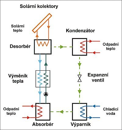 Absorpční chladicí jednotky jsou obecně známé a zavedené na trhu, především v USA a Asii. Absorpční cyklus je v podstatě podobný parnímu kompresorovému cyklu. Zásadním rozdílem je způsob stlačení chladiva (viz obr. 2, v levé části schématu). V absorpční jednotce je stlačení chladiva (komprese) docíleno nejprve rozpuštěním chladiva v kapalném sorbentu v absorbéru (absorpční teplo je odvedeno), a poté je bohatý roztok přečerpán na vyšší tlak běžným oběhovým čerpadlem. Chladivo s nízkým bodem varu je vypuzeno z roztoku teplem dodaným ze solárních kolektorů do desorbéru (generátoru). Tímto způsobem je chladivo stlačeno bez vysoké spotřeby mechanické práce jako u parních kompresorových cyklů. Páry chladiva se poté srážejí v kondenzátoru (kondenzační teplo je odvedeno) a po expanzi na nízký tlak se opět vypařují ve výparníku. Tím je zajištěn chladicí účinek a ve výparníku je odebíráno teplo vodě určené pro účely chlazení (výroba chladu). Páry chladiva jsou potom navráceny do roztoku v absorbéru, kde se znovu rozpouštějí. Mezi absorbérem a desorbérem se oběhovým čerpadlem dopravuje bohatý a ochuzený roztok s rekuperací tepla v tepelném výměníku.