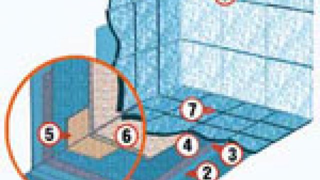 1. betonová vana, 2. EMULSION - penetrace, 3. AMS - vyrovnávací malta, 4. 2K ABDICHTUNG - stěrková izolace, 5. ELASTIKOBAND - pružný pásek, 6. FLEX-FM - profi flexibilní lepící malta, 7. EPOXIFUGENBUNT - epoxidová spárová hmota, 8. FUGENFLEX-SE - sanitární silikon