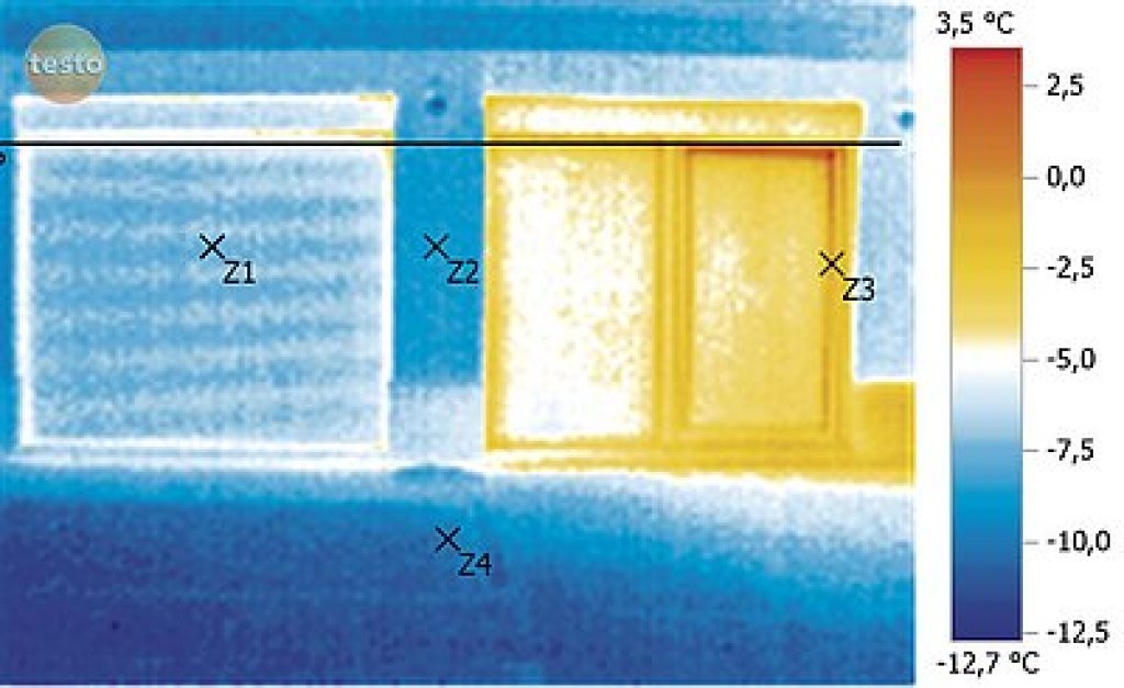 Na termosnímku je možné určit jakékoliv množství referenčních bodů a zjistit tak, jaká je přesná venkovní teplota v tomto daném místě. Ve zde uvedeném případě bod Z1 ukazuje teplotu zatažené rolety, bod Z2 teplotu fasády, bod Z3 teplotu okna s vytaženou roletou, bod Z4 teplotu země. Zatímco teploty bodů 1,2 a 4 se jen nepatrně liší od teploty okolního vzduchu (cca o 1 °C), teplota okna (bod 3) je o 9,2 °C teplejší než vzduch. Z toho vyplývá, že dochází k opravdu velkým tepelným ztrátám.