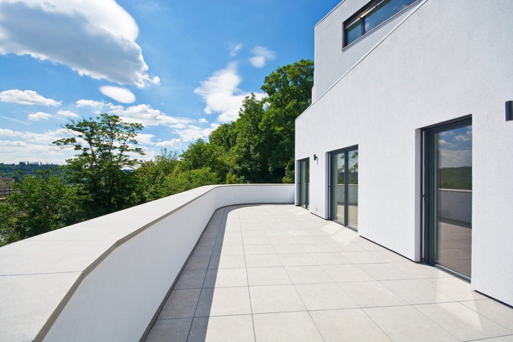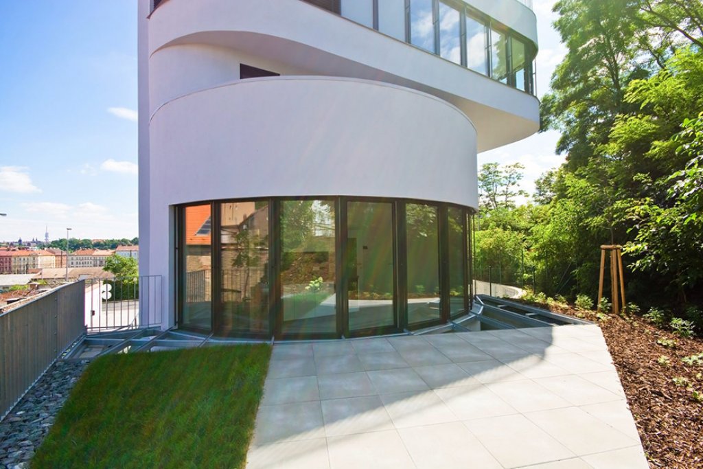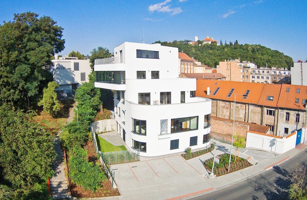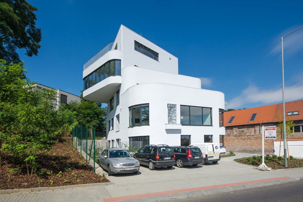 Nová Koulka si stavební pozemek nezjednodušuje, naopak složitý pozemek se otiskl do její architektury. Oblá hmota Nové Koulky s výhledem na Vyšehrad plynule a soudobě vyrůstá z místa. Výraz stavby je založen na práci s hmotou, objemem a skladbu jednotlivých částí. Navržené materiály jednoduchého povrchu fasády, okenních pásů, pohledového betonu nebo detailů z ploché ocele. To samé platí ohledně barevného řešení v odstínech šedi. Hmotu stavby tvoří navrstvení a propojení čtyř celků nepravidelných oblých tvarů. Od ulice ustupující kaskádovité řazení koresponduje se stoupáním okolního prostoru i architektury. Ustoupení hmot umožňuje pochozí terasy výše položených podlaží.