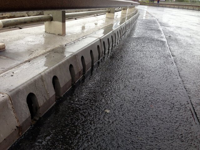 Na mostech tak při dešti nevznikají hluboké louže, nebezpečné pro provoz a aquaplaning. Při nadzemním křížení silnic nebo dálnic pak třeba voda nestříká na komunikaci probíhající pod mostem. Mostní obrubníkové odvodňovací prvky také nezasahují do vozovky. Pojezdová šířka komunikace není omezena žádnou vpustí, díky tomu je využitelná po celé šířce, od obrubníku k obrubníku. To se velice osvědčilo i při prudkých deštích na rekonstruovaném mostě přes Štěrboholskou magistrálu v Praze, kde se letos právě realizuje druhá etapa.